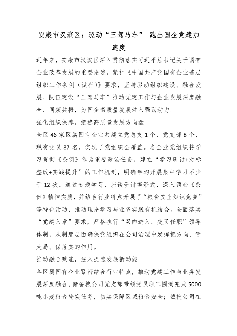 首页写作素材安康市汉滨区:驱动“三驾马车” 跑出国企党建加速度