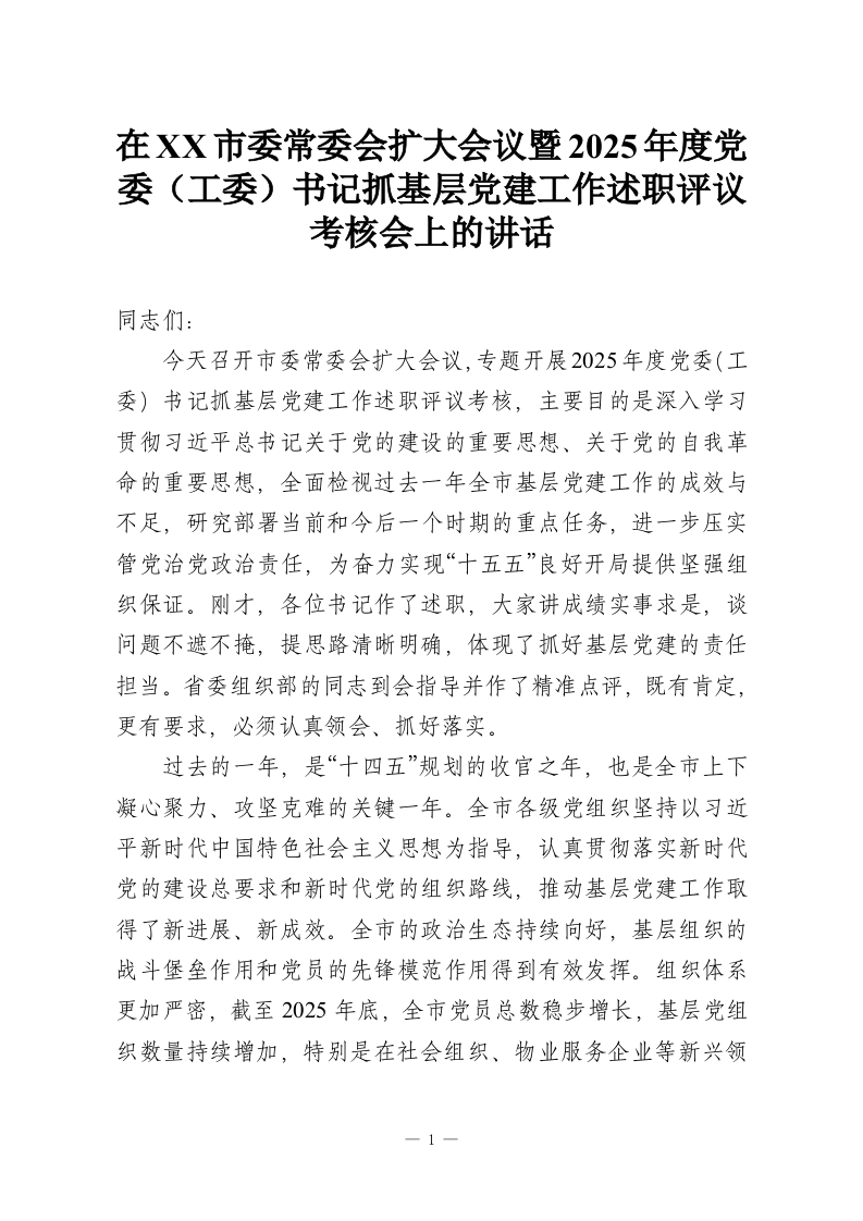 在XX市委常委会扩大会议暨2025年度党委(工委)书记抓基层党建工作述职评议考核会上的讲话
