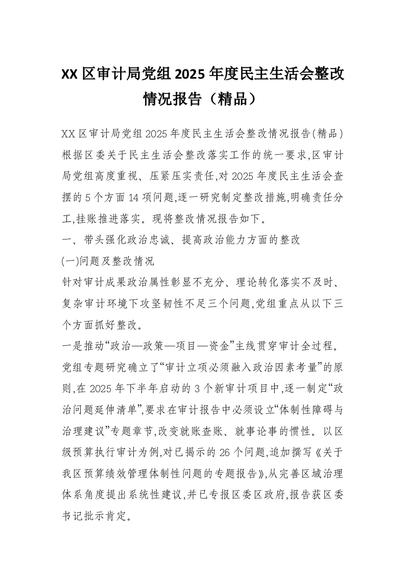 XX区审计局党组2025年度民主生活会整改情况报告(精品)