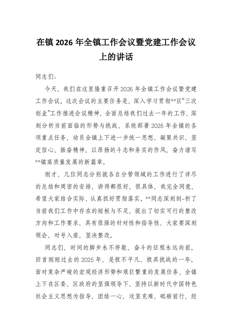 在镇2026年全镇工作会议暨党建工作会议上的讲话