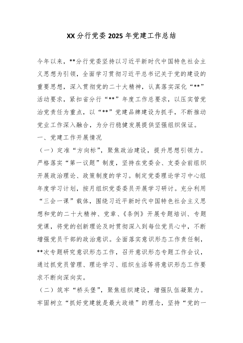 XX分行党委2025年党建工作总结
