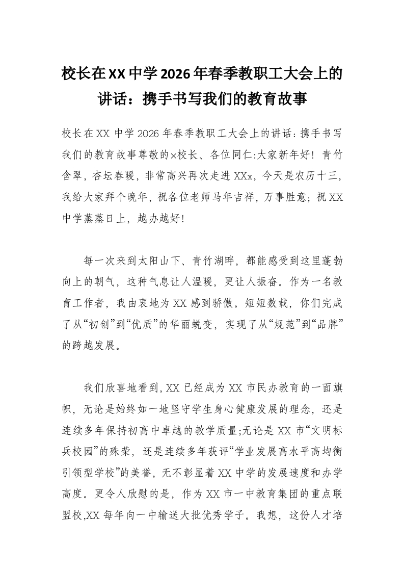 首页工作文档校长在XX中学2026年春季教职工大会上的讲话:携手书写我们的教育故事