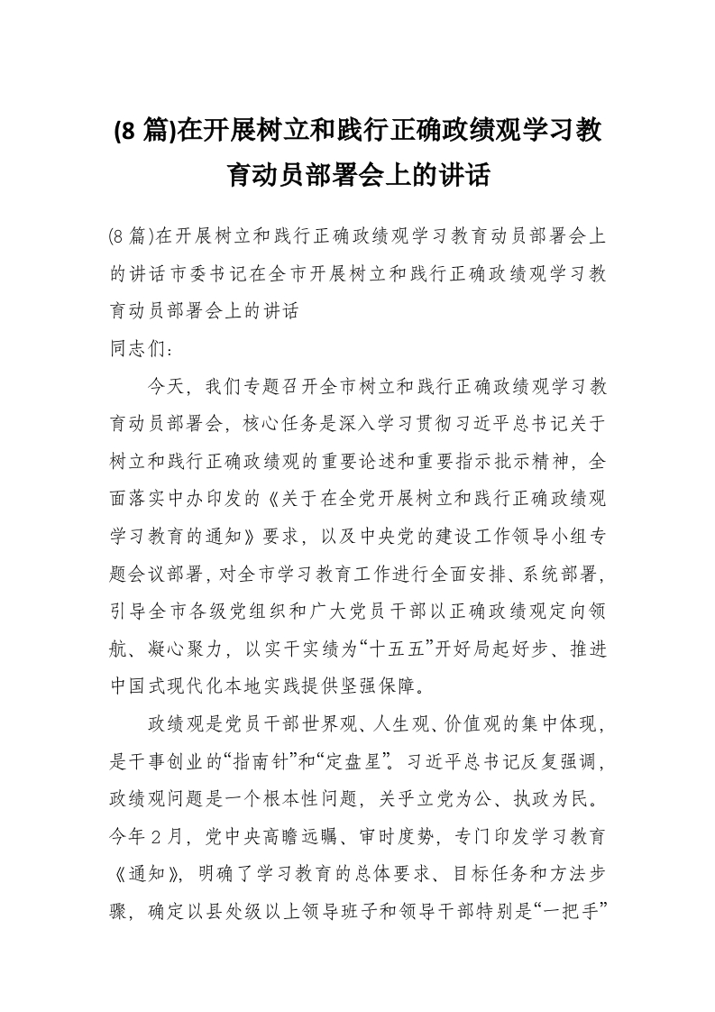 (8篇)在开展树立和践行正确政绩观学习教育动员部署会上的讲话