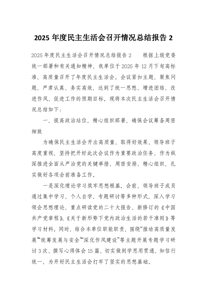 首页学习提升2025年度民主生活会召开情况总结报告2