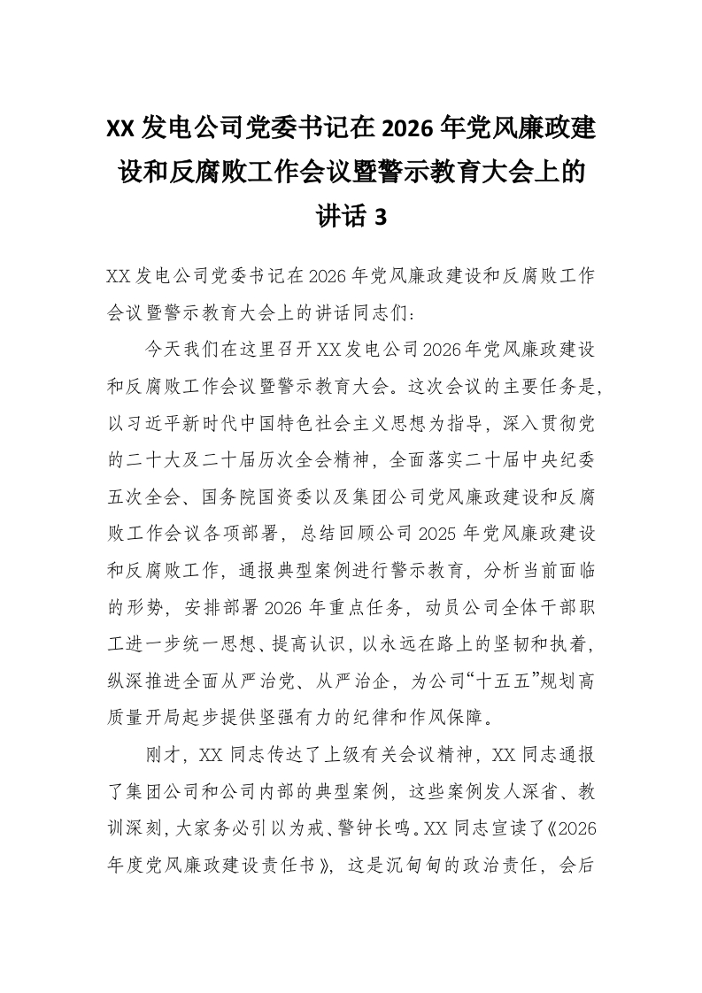 XX发电公司党委书记在2026年党风廉政建设和反腐败工作会议暨警示教育大会上的讲话3