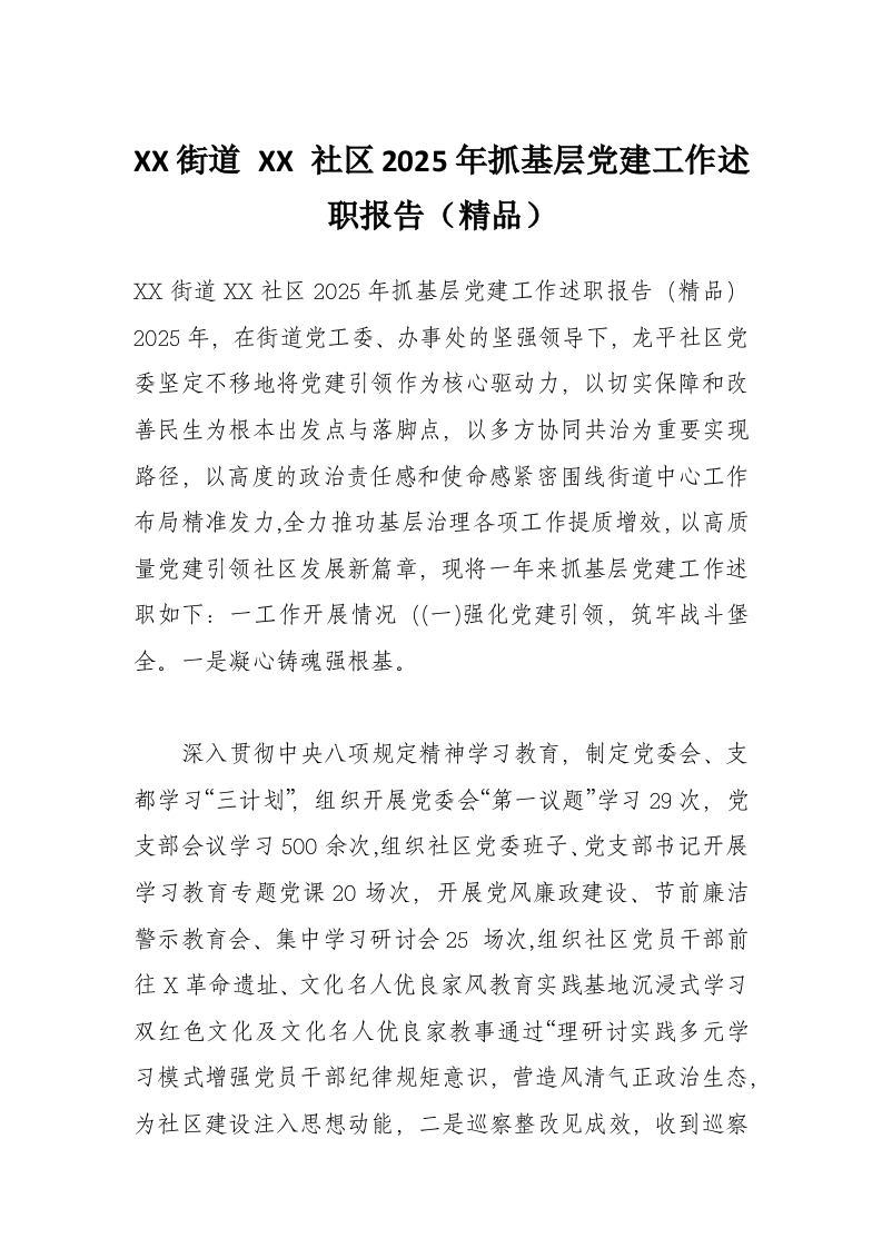 XX街道 XX 社区2025年抓基层党建工作述职报告(精品)