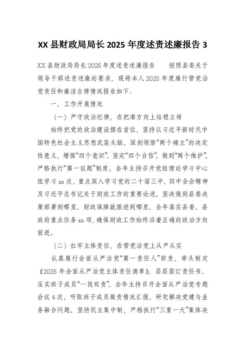 XX县财政局局长2025年度述责述廉报告3