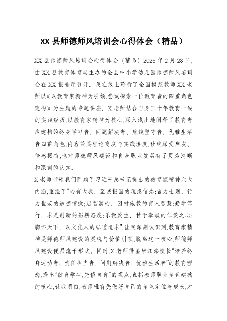 XX县师德师风培训会心得体会(精品)
