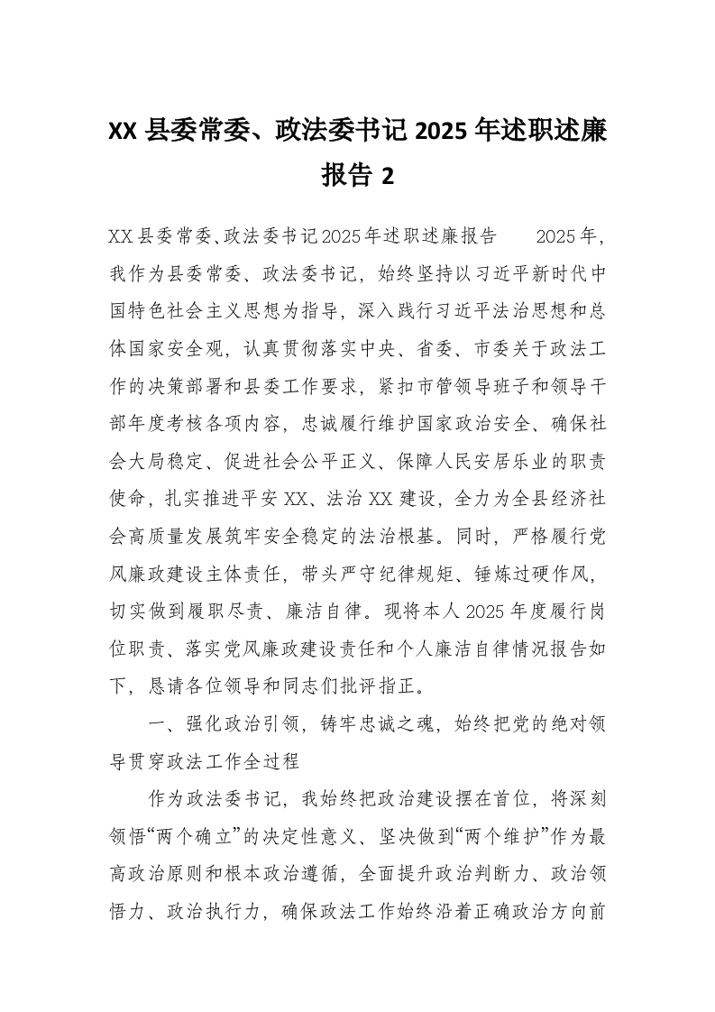 首页学习提升XX县委常委、政法委书记2025年述职述廉报告2