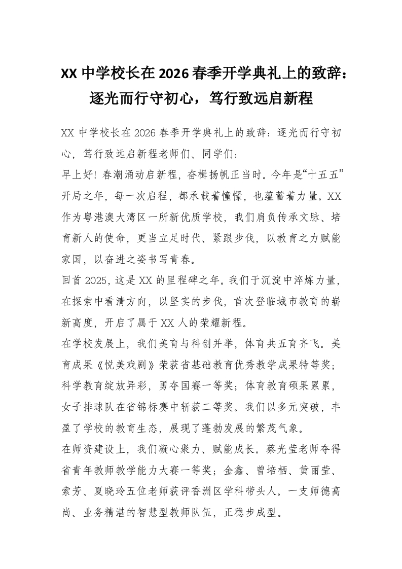 XX中学校长在2026春季开学典礼上的致辞:逐光而行守初心,笃行致远启新程