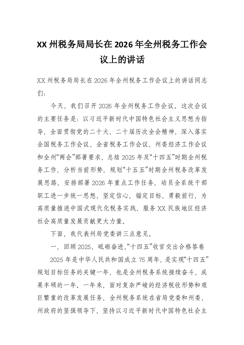 XX州税务局局长在2026年全州税务工作会议上的讲话