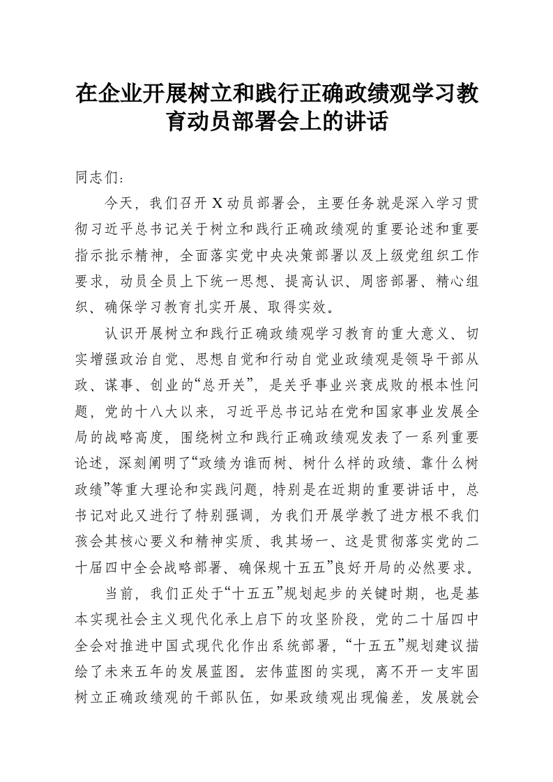 在企业开展树立和践行正确政绩观学习教育动员部署会上的讲话