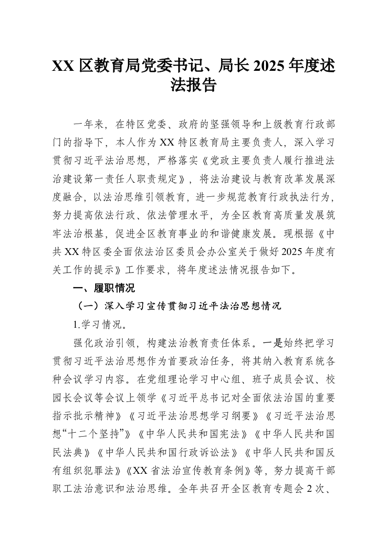 首页讲课讲稿XX区教育局党委书记、局长2025年度述法报告