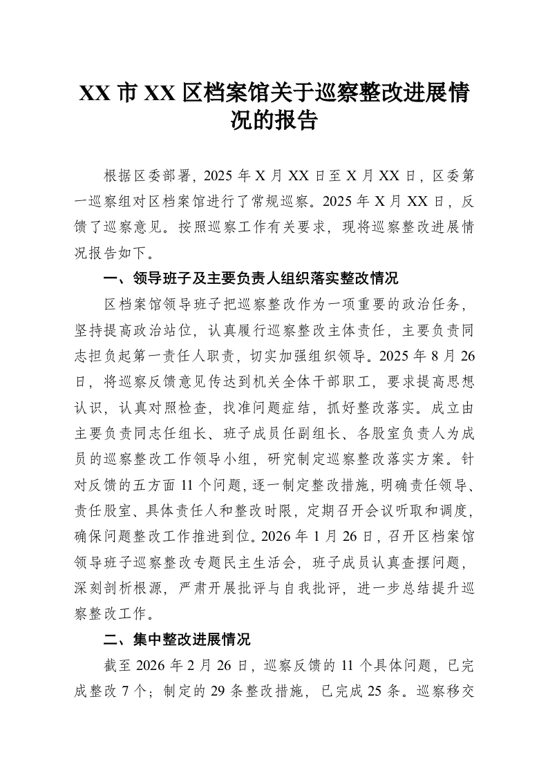 XX市XX区档案馆关于巡察整改进展情况的报告