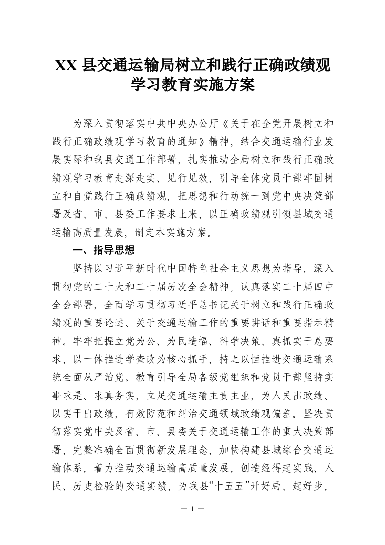 XX县交通运输局树立和践行正确政绩观学习教育实施方案