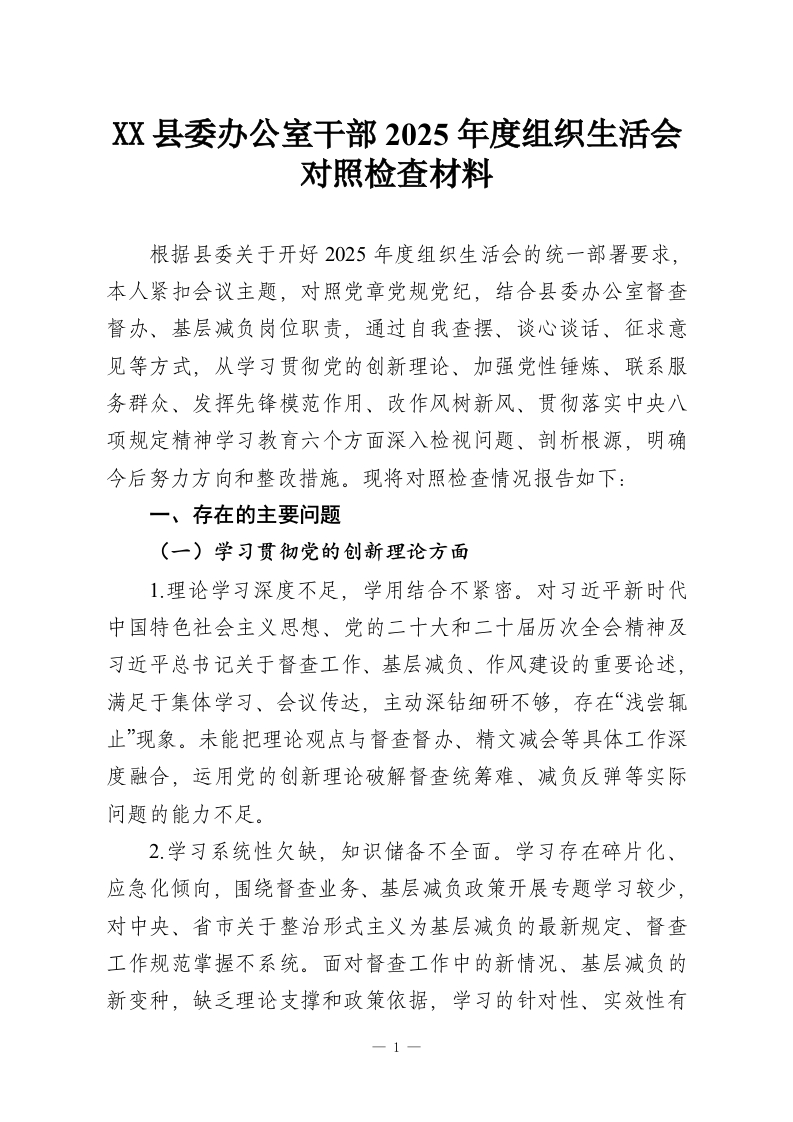 XX县委办公室干部2025年度组织生活会对照检查材料