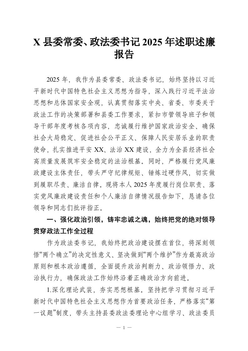 X县委常委、政法委书记2025年述职述廉报告