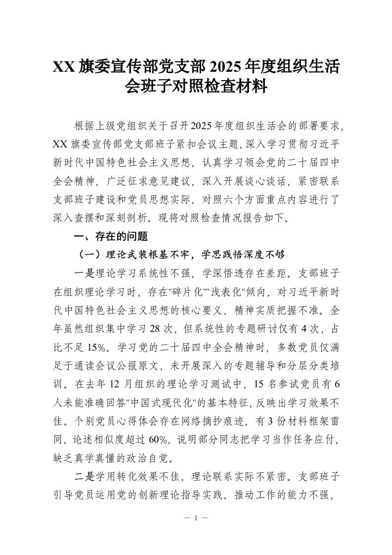 首页材料汇编XX旗委宣传部党支部2025年度组织生活会班子对照检查材料
