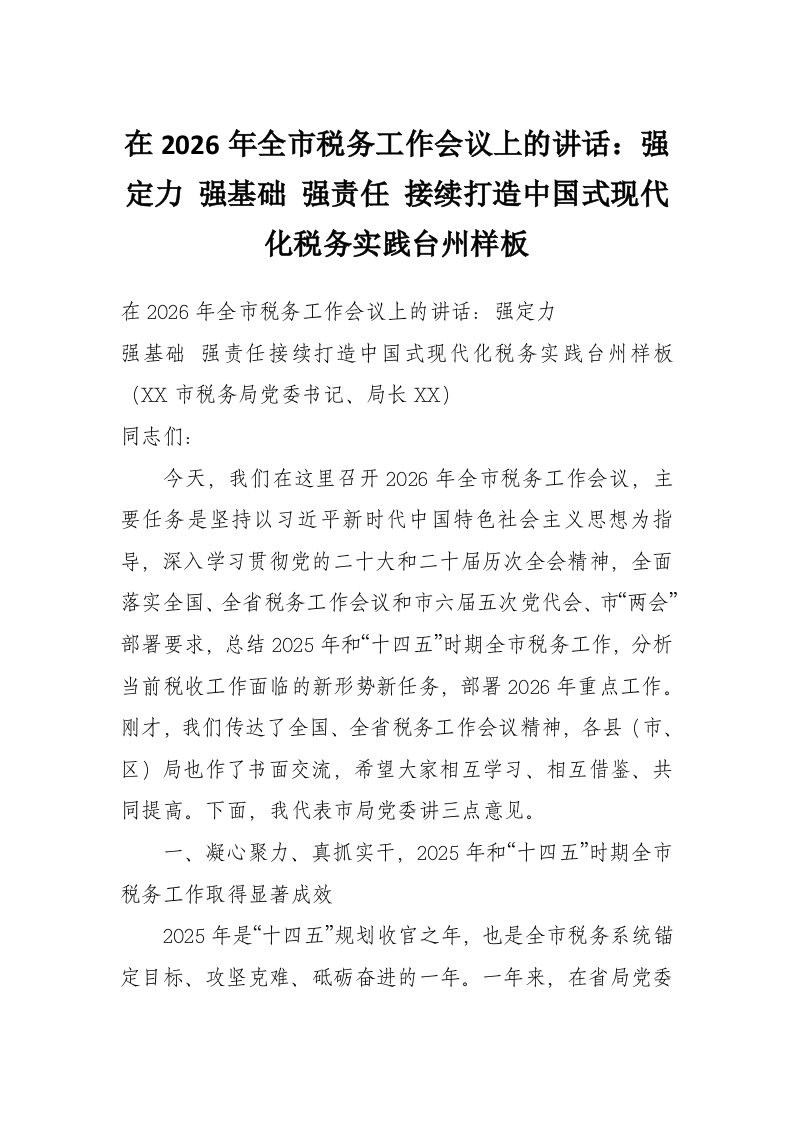 首页精选范文在2026年全市税务工作会议上的讲话:强定力 强基础 强责任 接续打造中国式现代化税务实践台州样板