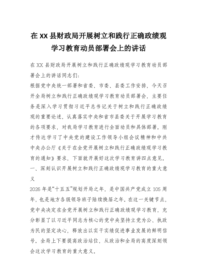 首页讲课讲稿在XX县财政局开展树立和践行正确政绩观学习教育动员部署会上的讲话