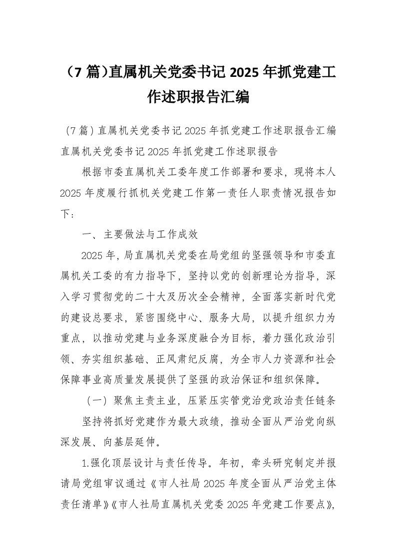 (7篇)直属机关党委书记2025年抓党建工作述职报告汇编