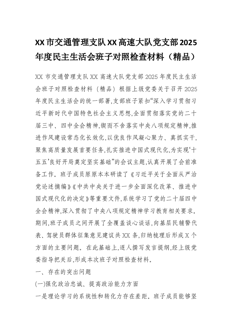 首页工作文档XX市交通管理支队XX高速大队党支部2025年度民主生活会班子对照检查材料(精品)
