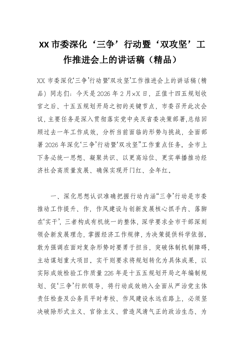 XX市委深化‘三争’行动暨‘双攻坚’工作推进会上的讲话稿(精品)