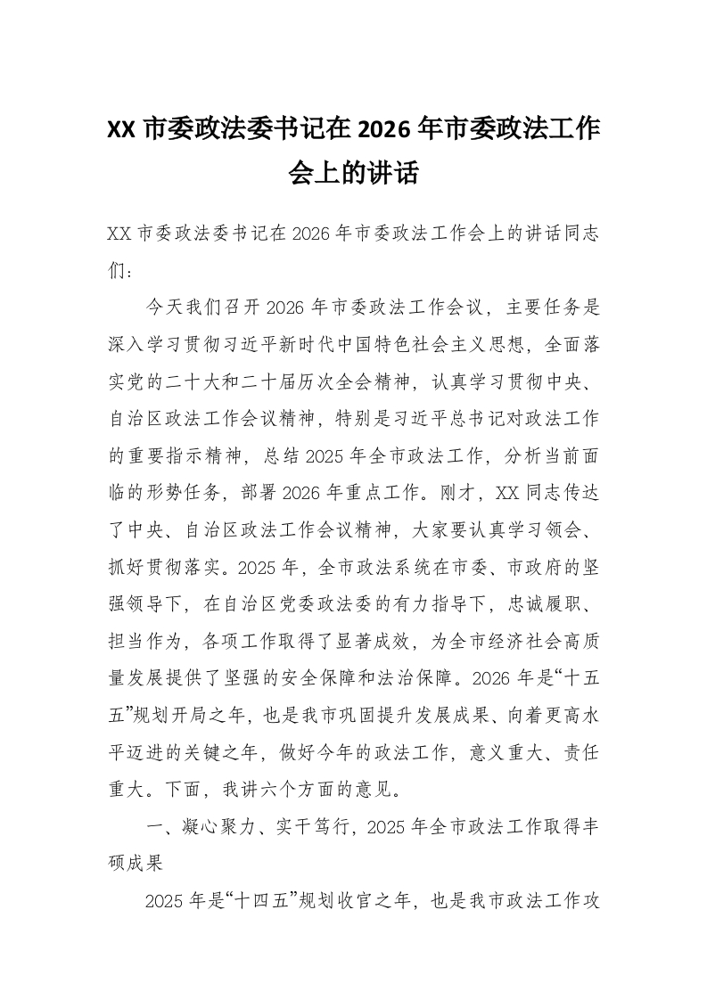 XX市委政法委书记在2026年市委政法工作会上的讲话