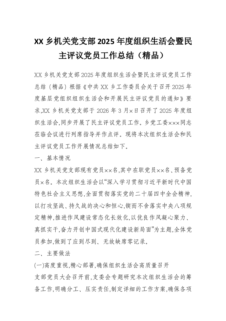 XX乡机关党支部2025年度组织生活会暨民主评议党员工作总结(精品)