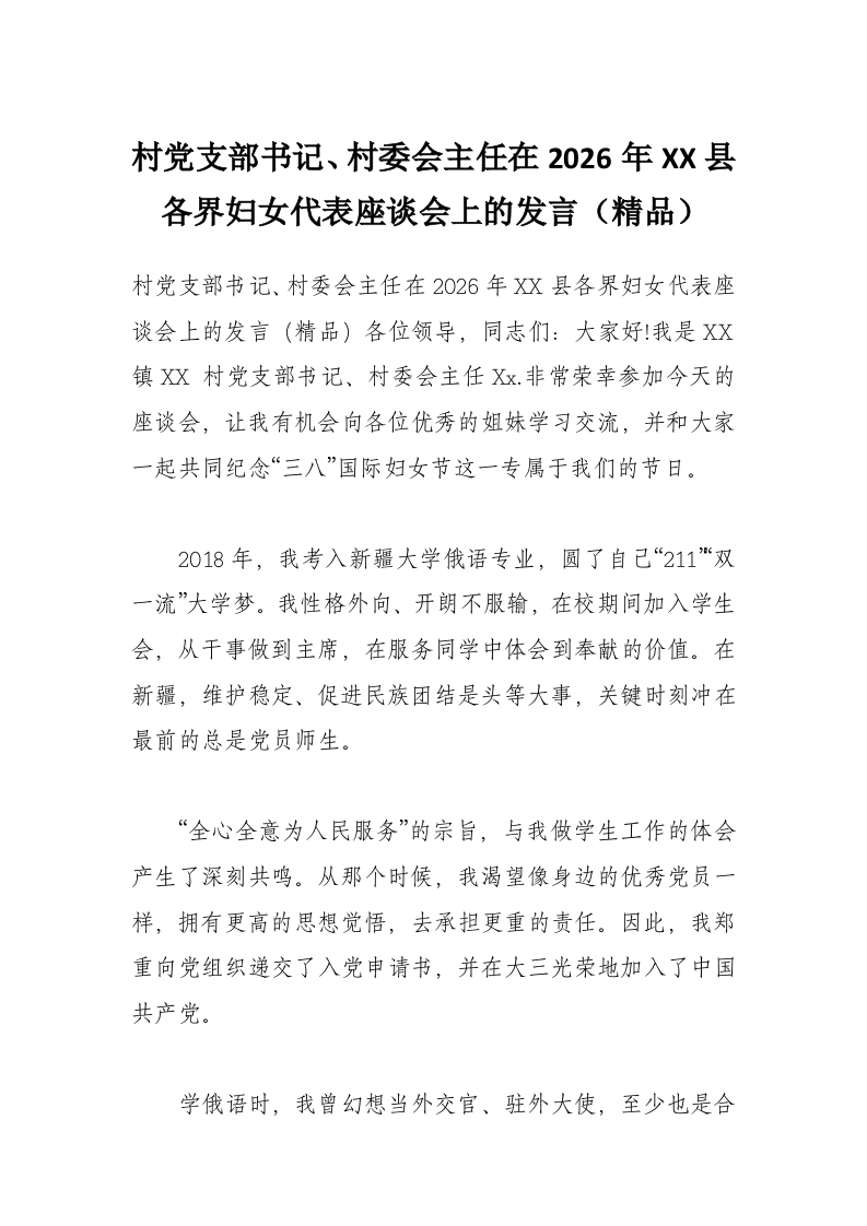 村党支部书记、村委会主任在2026年XX县各界妇女代表座谈会上的发言(精品)