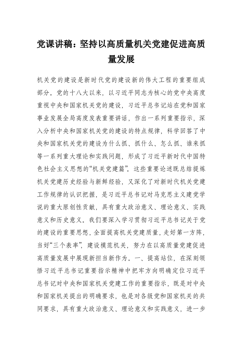 党课讲稿:坚持以高质量机关党建促进高质量发展