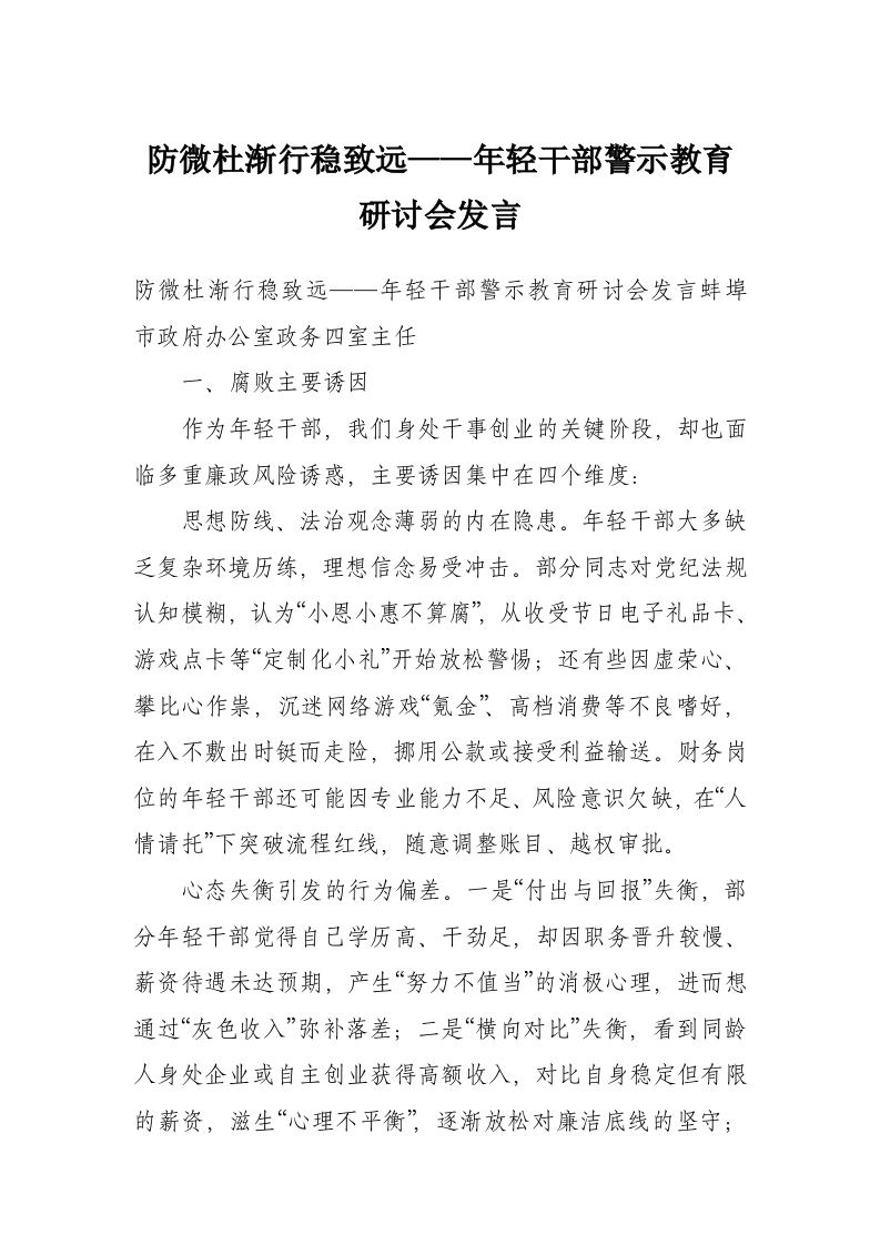 防微杜渐行稳致远——年轻干部警示教育研讨会发言