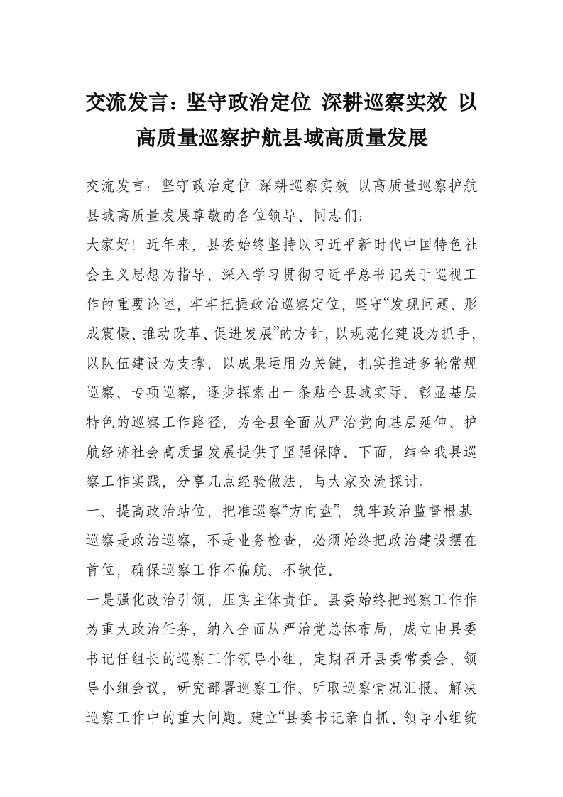 交流发言:坚守政治定位 深耕巡察实效 以高质量巡察护航县域高质量发展